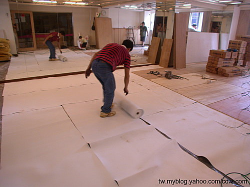 不過面對一個樓高受限制的案子,就不能做高架地板,因為高架之後地板高度上升,加上舞者本身跳躍的高度必然會撞上天花板,因此只能做夾面板施工,而解決的方法是當鋪完防潮布之後,加上一層EVA得泡棉,並適當控制泡棉厚度,就能達到要有彈性的作用。