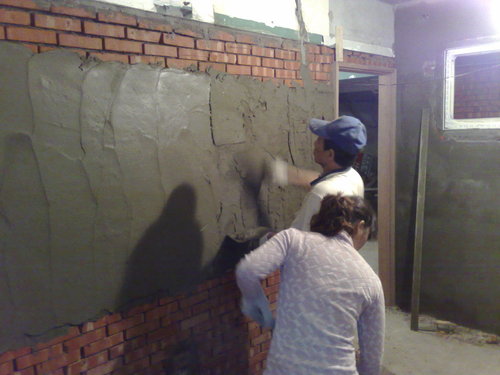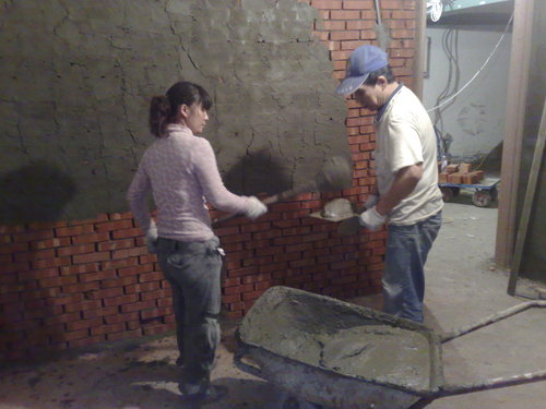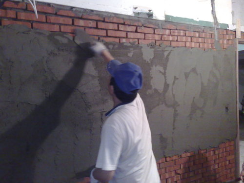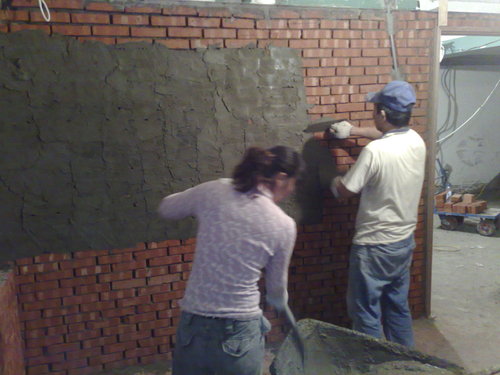當粉刷時 師傅先以含水量稍高的水泥沙