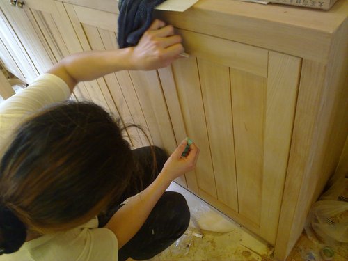 其中有一個工人在做木材細部硏磨工作